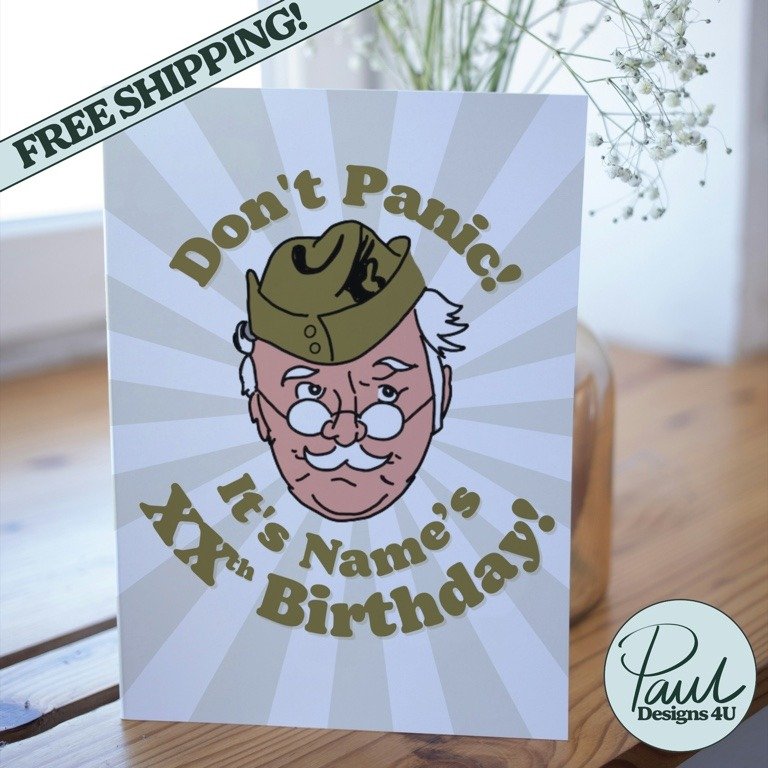 Don’t Panic Birthday Card – Hand-Drawn Corporal Jones Design, Personalised Name & Age, Premium Quality